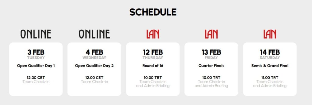 Açıklanana göre 25.000 dolarlık ödül havuzu olacak ve $500’lık giriş ücreti olacak. 5 Ocak’taki VRS sıralamasına göre kayıt yaptıran ilk dört takım direkt olarak LAN aşamasına katılacak. Online aşaması 3-4 Şubat tarihlerinde FACEIT üzerinden oynanacak. Elemeler 64, ana turnuva 16 takım arasında olacak.