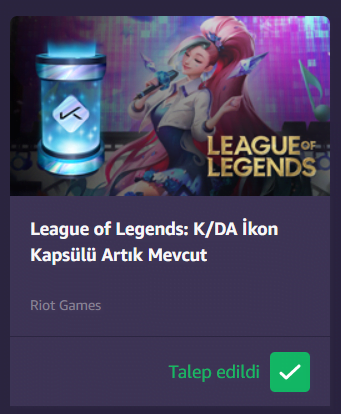 Sektöre güçlü bir başlangıç yapmasının ardından Türkiye marketine de bomba gibi düşen Amazon Prime, Riot Games ile bir iş birliği içerisine girdi. Bu iş birliği ile League of Legends için son çıkan K/DA şarkısının şerefine, Prime üyelerine ücretsiz ikon kapsülü hediye edilecek.