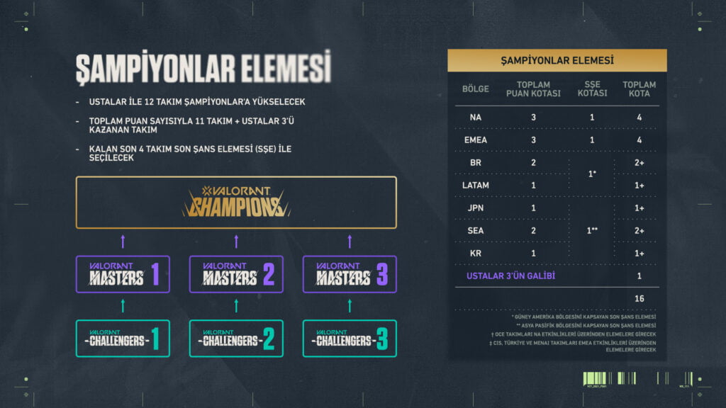 Profesyonel oyuncuların kendini gösterebileceği bir etkinlik olacak olan Şampiyonlar Turu, hem bölgesel hem de uluslararası turnuvalar şeklinde yapılacak. Valorant Şampiyonlar Turu hakkında paylaşılan video aşağıda verilmiştir.