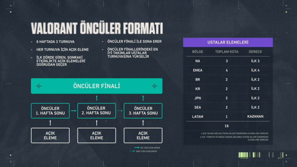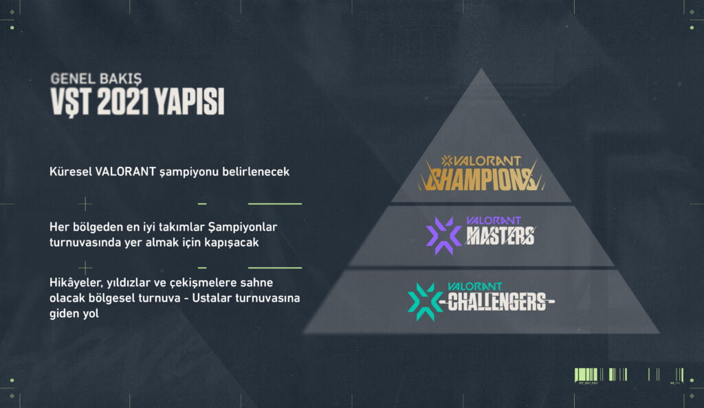 Üç farklı turnuva aşamasıyla Valorant Şampiyonlar Turu, Öncüler, Ustalar ve Şampiyonlar olarak karşımıza çıkacak. İlk olarak Öncüler etkinlikleri daha çok bölgesel rekabete odaklı olarak gerçekleşecek. Sekiz takımın yarışacağı bu kısım için açık elemeler yapılacak. Ayrıca Riot dışında Ignition Series etkinlikleri ve First Strike elemelerinde destek olan ortak turnuva organizatörleri ile gerçekleştirilecek.