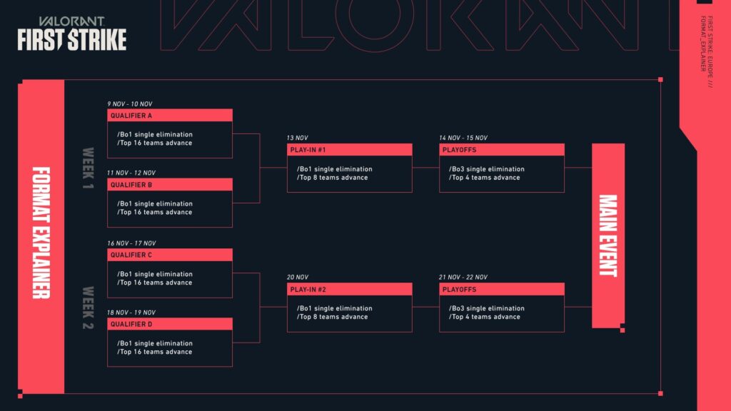 Elemeler bittikten sonra, ana turnuva 3-6 Aralık tarihleri arasında yapılacak. Avrupa’nın en iyi sekiz takımı, Bo3 formatındaki maçlarla karşı karşıya gelip Valorant First Strike: Avrupa şampiyonluğu için karşılaşacak. Çeyrek finaller 3-4 Aralık‘ta, ardından yarı finaller 5 Aralık‘ta gerçekleşecek.