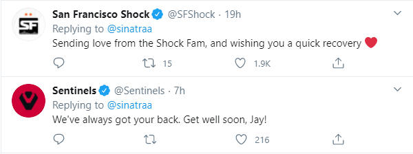 Kalıcı bir hasar almadan durumu atlatmayı başaran Sinatraa‘ya sevenleri geçmiş olsun dileklerini iletti. Overwatch oynarken forma giydiği takımı San Fransisco Shock ve güncel VALORANT takımı Sentinels de oyuncuya destek oldu.