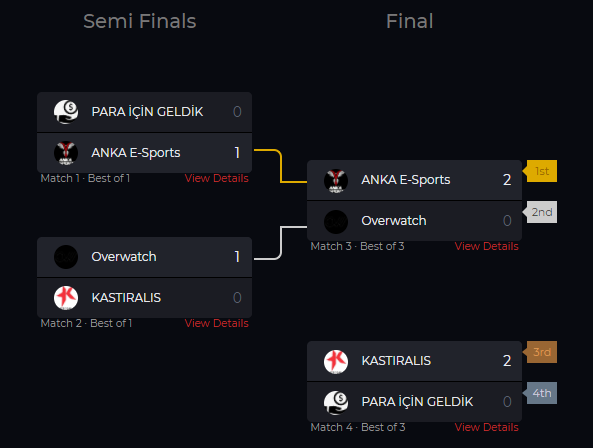 Yarı finallerde ANKA E-Sports ile PARA İÇİN GELDİK karşılaştı ve Bo1 formatında maçta galibiyet ANKA E-Sports’un oldu.