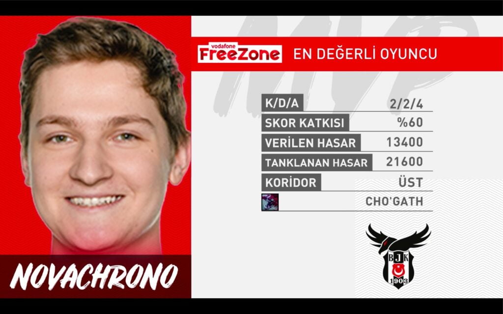 Karşılaşmanın En Değerli Oyuncusu, tankladığı 21600 hasar ile Cho’Gath Novachrono oldu.