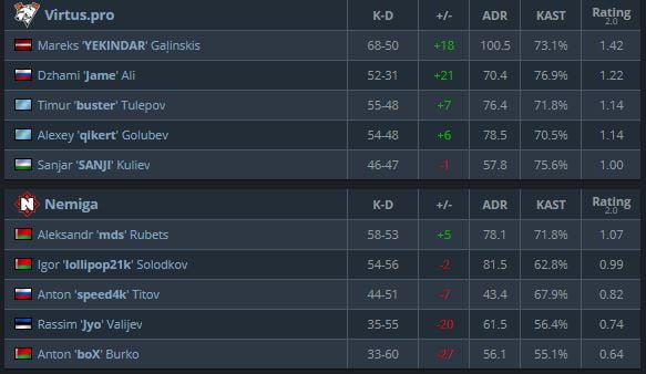 IEM New York 2020 CIS Büyük Finali’nde karşı karşıya gelen Nemiga Gaming ve Virtus.pro takımları ilk olarak Train ve Nuke haritalarını yasakladı. Daha sonra ise Nemiga takımı Mirage haritasında oynamayı tercih etti. İlk yarıda Nemiga Gaming 8-7 üstünlük sağlasa da ikinci yarıda bu üstünlüğü koruyamadı ve Virtus.pro ikinci yarıyı 9-4 kazanarak ilk haritayı 16-12 kazandı ve 1-0 öne geçti.