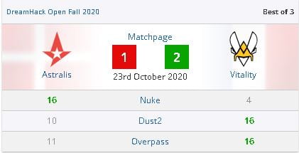 Fransızlar, Astralis‘in kendileri üzerindeki altı maçlık serisini bozdu. Vitality, DreamHack Open Fall turnuvasının üst ağaç finalinde Astralis’i 2-1 mağlup etti. Astralis, Heroic-NiP karşılaşmasının kazananıyla eşleşecek ve rövanş için bir şansı daha olacak. Vitality, BLAST Premier Spring Europe Finalleri, cs_summit 6 Europe ve ESL One Cologne 2020 Europe’da ikincilerini tamamladıktan sonra bu yıl bir turnuvayı kazanmak için dördüncü şansını elde edecek.