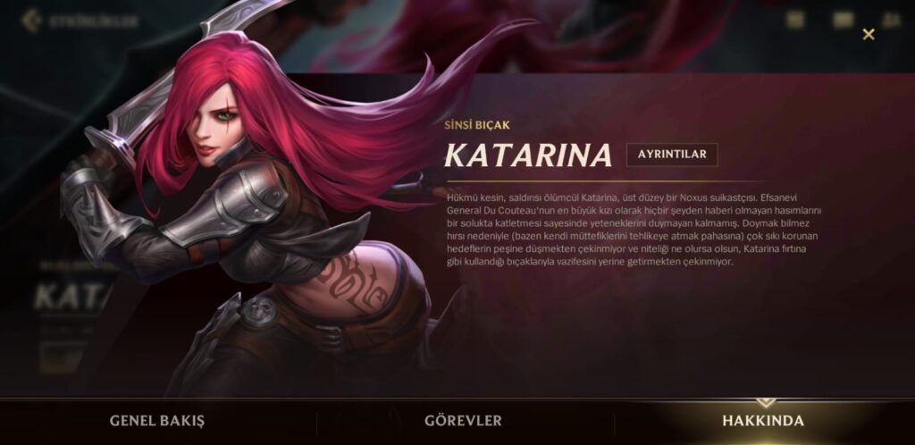 | İki Bıçağın Sesi Var | 5 oyun oyna. VEYA Garen’in rakip takımda olduğu 1 oyun kazan. | Katarina (şampiyon) |
