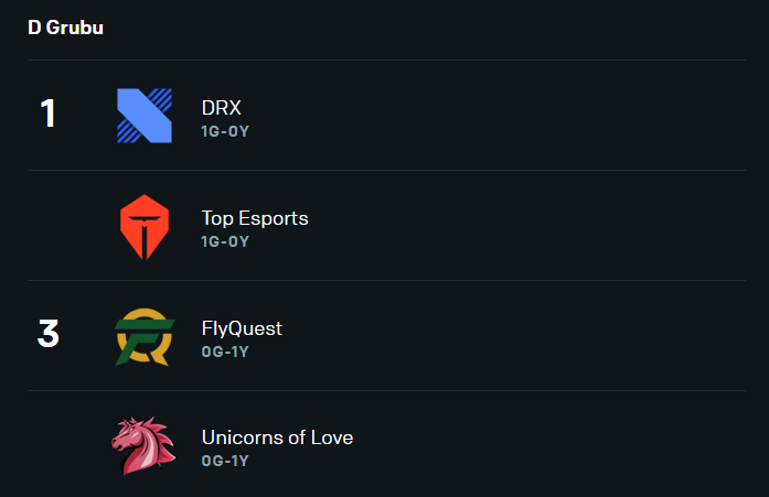 İkinci karşılaşma D Grubu’nda diğer iki takım olan Unicorns of Love ve DRX arasında oynandı. LCL ekibi Unicorns of Love, Güney Kore ligi olan LCK’yi ikinci bitiren rakibi DRX karşısında direnemedi. DRX çok net bir galibiyet aldı.