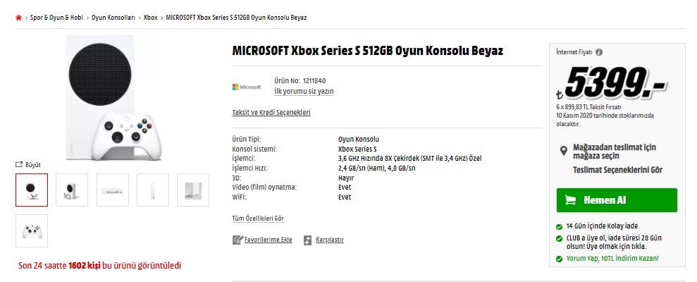 Microsoft Xbox Series S 512 GB White, ise 5399 ₺ fiyat etiketiyle piyasaya sunulacak. Tekrar hatırlatmak gerekirse bu iki yeni nesil oyun konsollarının, ülkemizde 10 Kasım tarihi itibarıyla raflardaki yerini alacağı ön görülüyor.