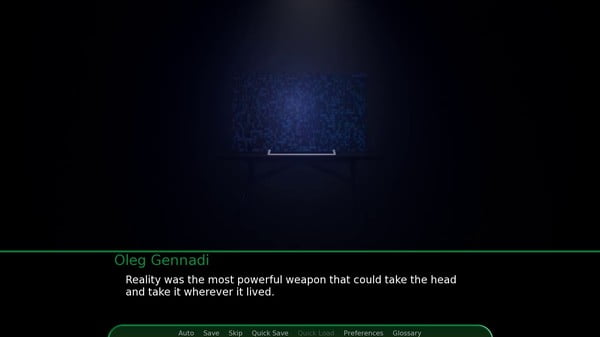 Edebi yönüyle ön plana çıkan, kısa bir oyun. Kullanılan üslup, kelimeler ve cümle yapıları özenle seçilmiş. Bir saatten kısa sürede bitirmeniz mümkün lakin oyunu tam olarak anlayabilmeniz için birkaç kez daha oynamanız gerekiyor. İlk bölümlerinde bir şey anlamamanız da gayet normal. Hatta sıkılıp kapatabilirsiniz de. Ama bunu tavsiye etmem; çünkü bölümler ilerledikçe oyunun temposu da gitgide artıyor, en heyecanlı yerinde ise maalesef sona eriyor..