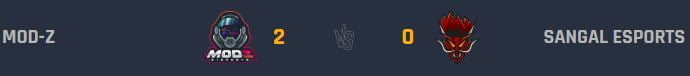 Günün oynanan dördüncü maçında Zula Süper Ligi son şampiyonu MOD-Z ekibi sahaya çıktı. Karşısında lige yeni katılan ve ilk kez gördüğümüz başarılı espor takımı Sangal Esports vardı. İki güçlü ekibin zevkli karşılaşmasında gülen taraf son şampiyon MOD-Z ekibi oldu. Maçın başından sonuna oynanan tüm haritalarında üstünlüğü bir şekilde ele almayı başarabilen taraf olan MOD-Z, maçı toplam skorda 2 – 0 ile kazanarak önemli bir galibiyet aldı.